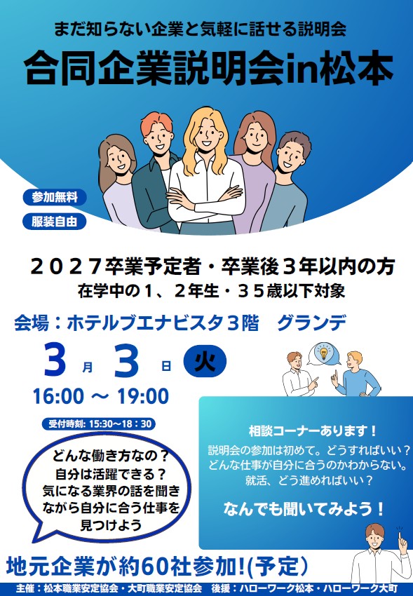 今回、松本職業安定協会さまのご配慮があり開催時間帯を夕方以降に設定していただいております。離職者の方だけではなく、就職者の方にも幅広くご来場いただけることに相成りました。